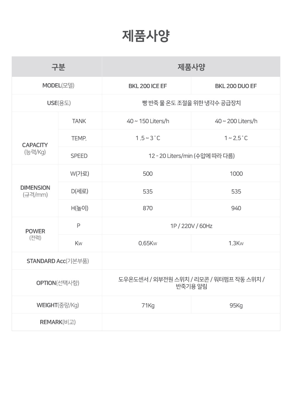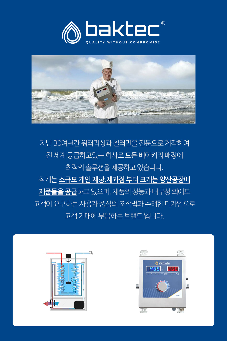 지난 30여년간 워터믹싱과 칠러, 측정기만을 전문으로 제작하여 전 세계 공급하고 있는 회사로 모든 베이커리 매장에 최적의 솔루션을 제공하고 있습니다.작게는 소규모 개인 제빵제과점부터 크게는 양산공장에 제품들을 공급하고 있으며 제품의 성능과 내구성 외에도 고객이 요구하는 사용자 중심의 조작법과 미려한 디자인으로 고객 기대에 부응하는 브랜드 입니다.