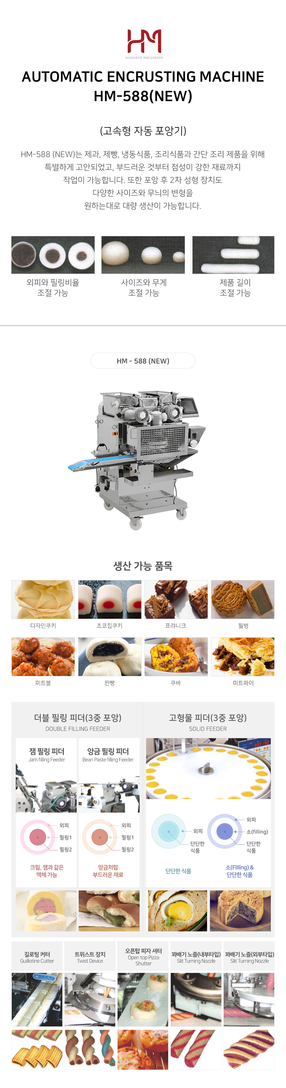 1992년에 설립된 HUNDRED MACHINERY사는 제과, 제빵을 위한 베이커리 기계 제작 뿐만 아니라 중, 대형공장용 자동화 라인을 생산하고 있습니다.시팅(Sheeting), 컷팅(Cutting), 필링(Filling), 폴딩(Folding), 포밍(Forming)과 성형(Mounding)등전 과정을 포함하고 있으며, 일본의 Sheon사와 같은 우수한 포앙 기술을 보유하고 있습니다.베이커리 장비의 개발솨 생산을 더불어 고객이 원하는 제품 개발과 공장 설립을 위한 노하우와전문 엔지니어링 서비스를 제공하고 있습니다.