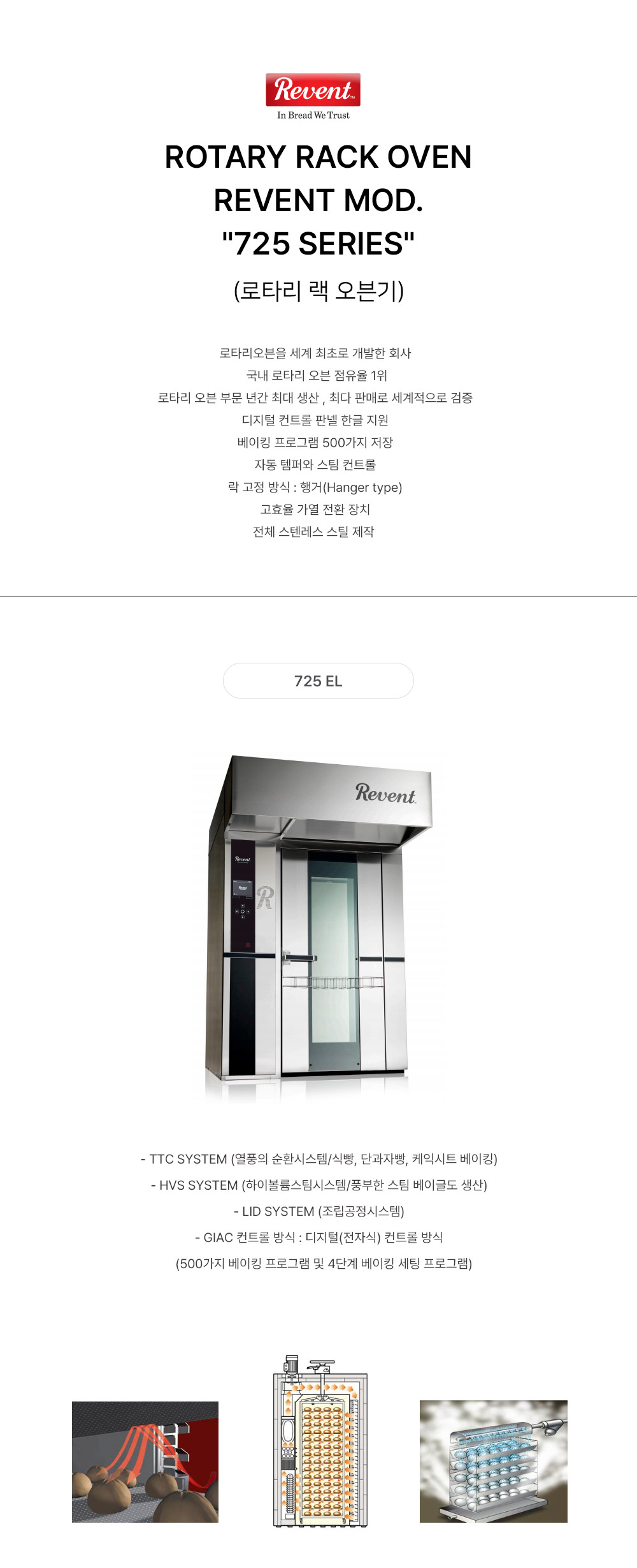 1958년 최초로 로타리 오븐을 제작하여 세계에서 가장 많이 팔린 로타리 오븐 제조회사로자리매김 하고 있습니다.REVENT사는 50여개국의 베이커들 사이에서 꾸준히 최고의 오븐으로 인지되고 있으며과거부터 기술 혁신을 통하여 사용자 중심의 로타리 오븐을 제작하고 있습니다.
